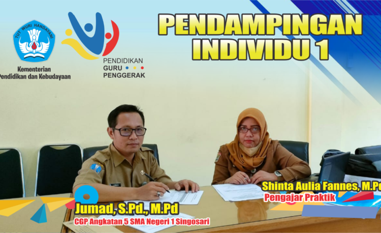 Pendampingan individu 1 untuk calon guru penggerak dari SMA Negeri 1 Singosari terjadwal mulai tanggal 13 Juni hingga 17 Juni 2022. Sebagaimana diketahui calon guru penggerak angkatan 5 dari SMA Negeri 1 Singosari ada tiga orang yaitu Pak Jumad, Bu Wiwik dan Bu Elfy. Ketiganya didampingi oleh pengajar praktik Ibu Shinta dari SMP Negeri 3 Singosari.