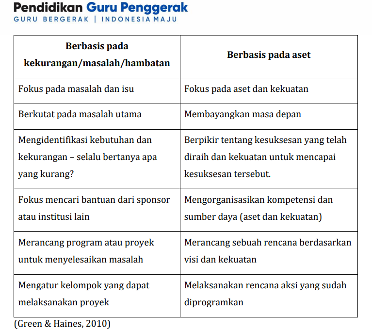 Green & Haines (2010) menjelaskan kecenderungan cara pandang yang menggunakan pendekatan berbasis kekurangan dengan pendekatan berbasis aset seperti yang dapat dilihat dari tabel di bawah ini.